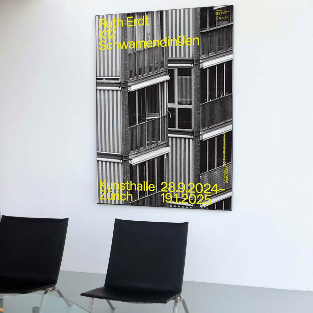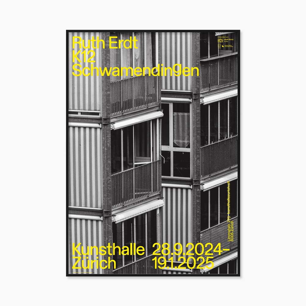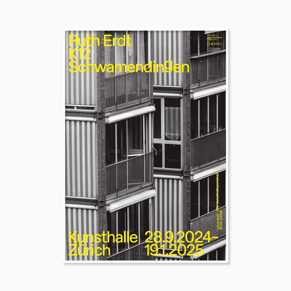 스위스 취리히에 자리한 현대미술관 ‘Kunsthalle Zürich’에서 2024년 열린 루스 에르트(Ruth Erdt, 1965~ )의 전시 'Ruth Erdt K12- Schwamendingen'를 기념하며 발행한 전시포스터다.