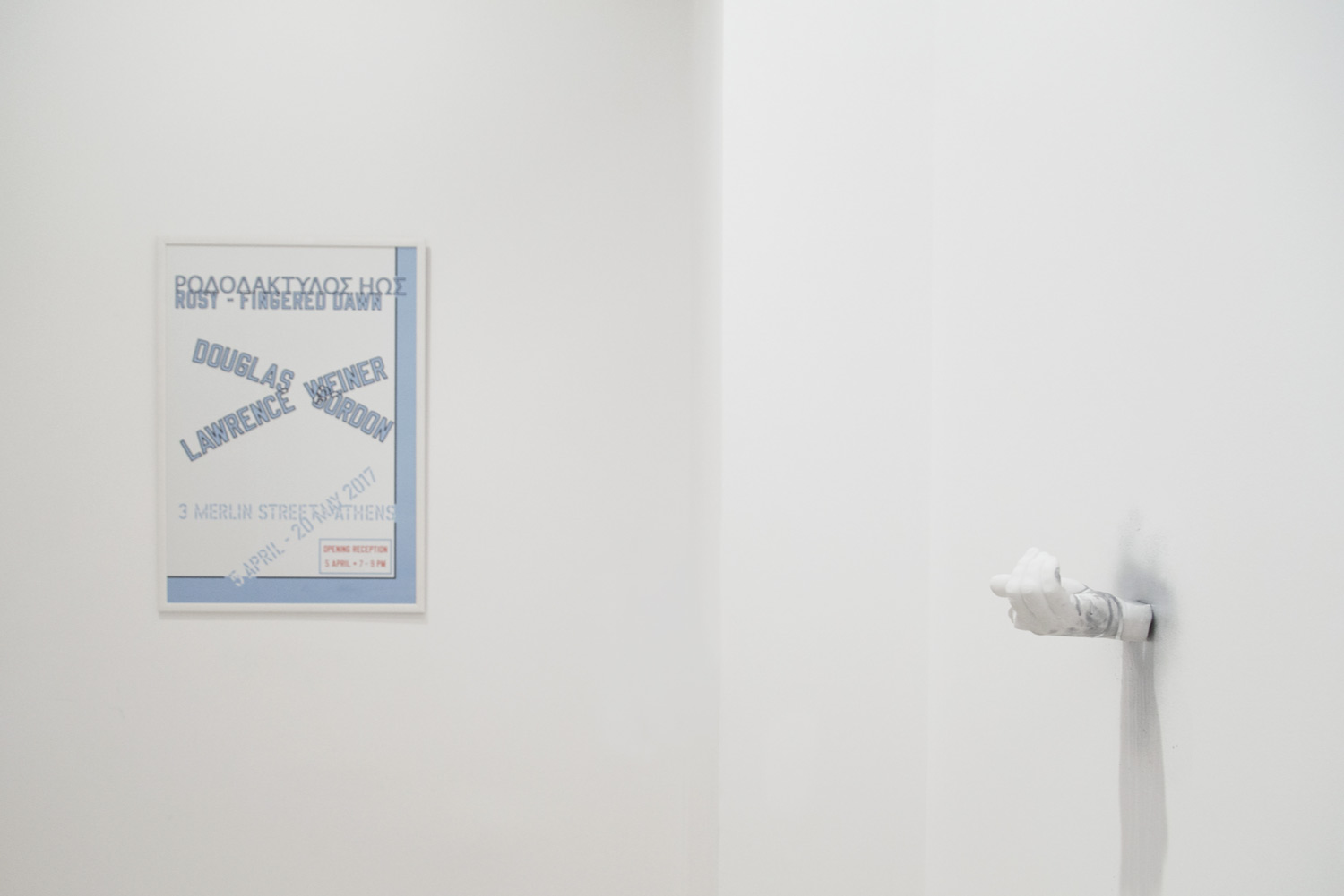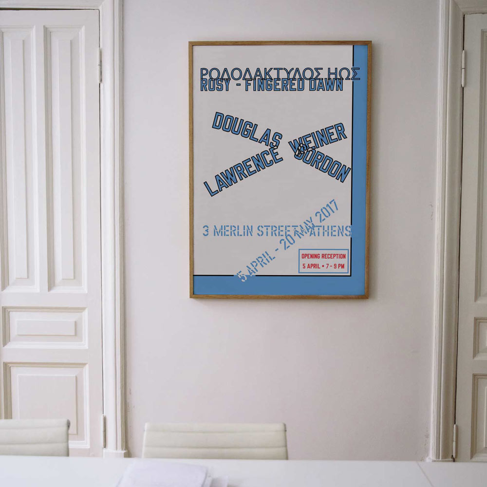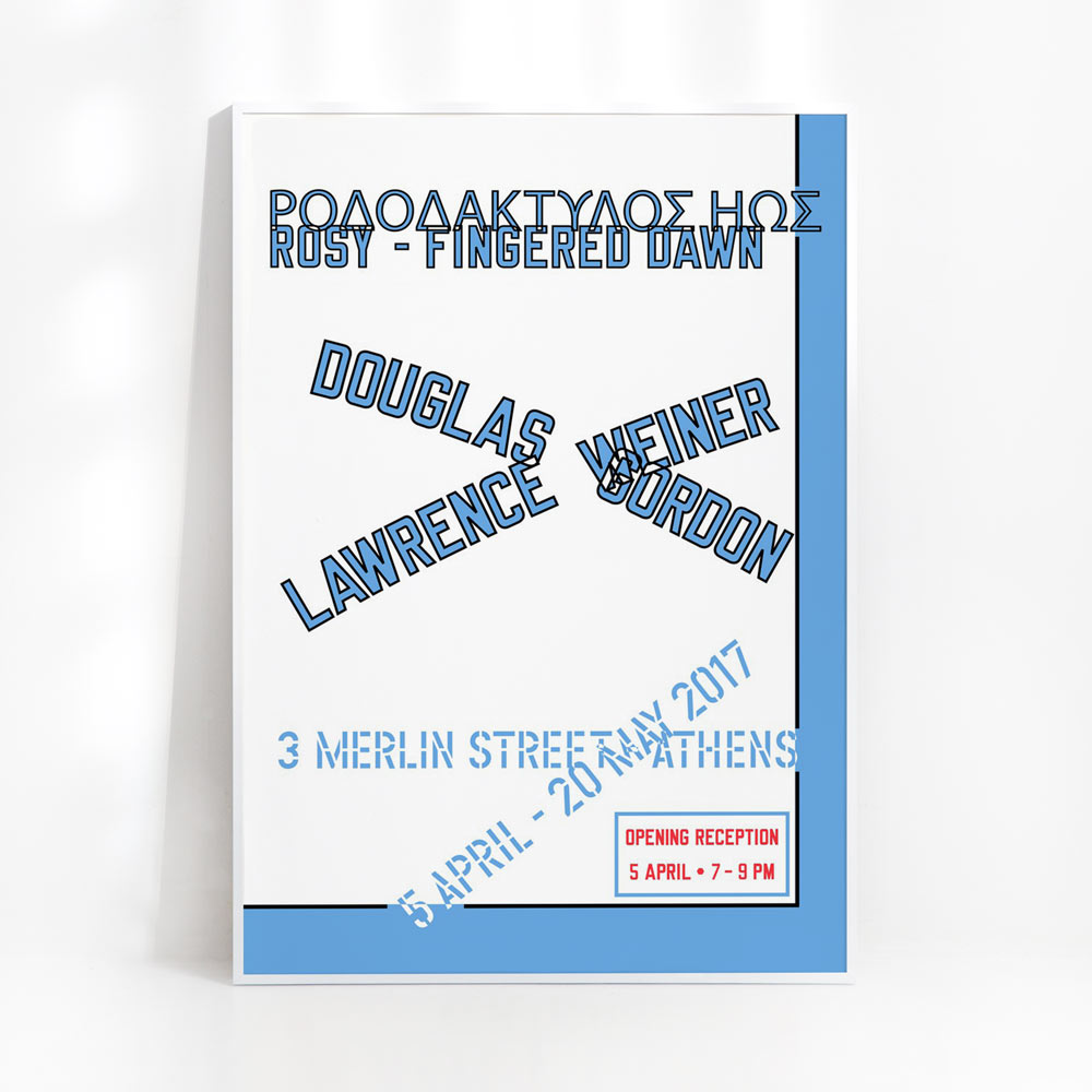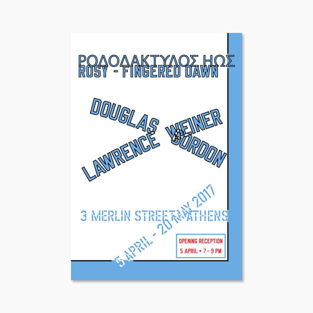 2017년 가고시안 갤러리 아테네에서 열린 더글라스 고든(Douglas Gordon, 1966~ )과 로렌스 와이너(Lawrence Weiner, 1942~2021)의 전시 ‘Rosy-Fingered Dawn’을 기념하며 발행한 전시포스터다.