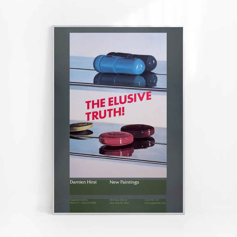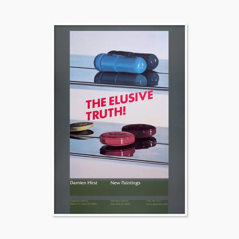 영국의 현대미술가 데미안 허스트(Damien Hirst, 1965~ )의 2004년 작품인 ‘Two Pills’를 모티프로 디자인한 이 포스터는 2005년 가고시안 갤러리에서 열린 전시 ‘The Elusive Truth at Gagosian’를 기념하며 발행되었다.