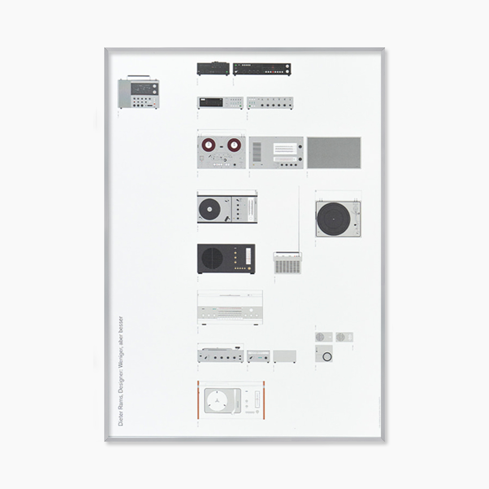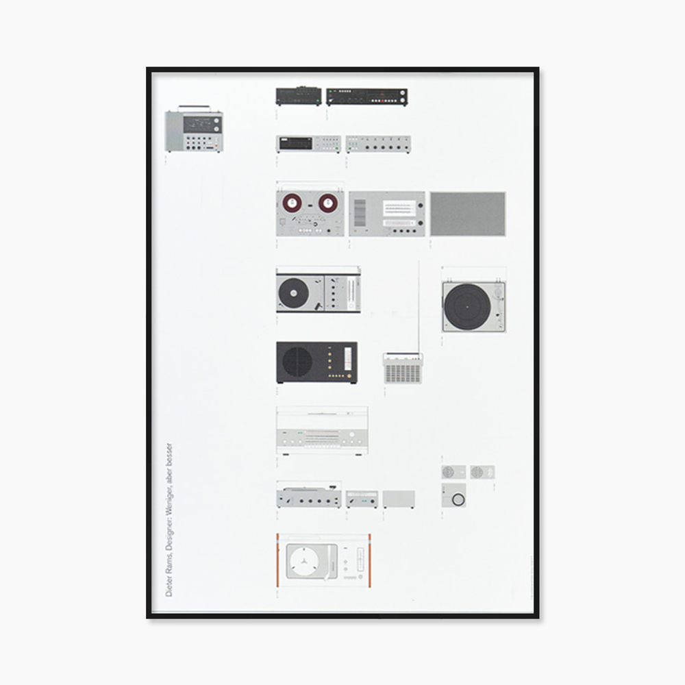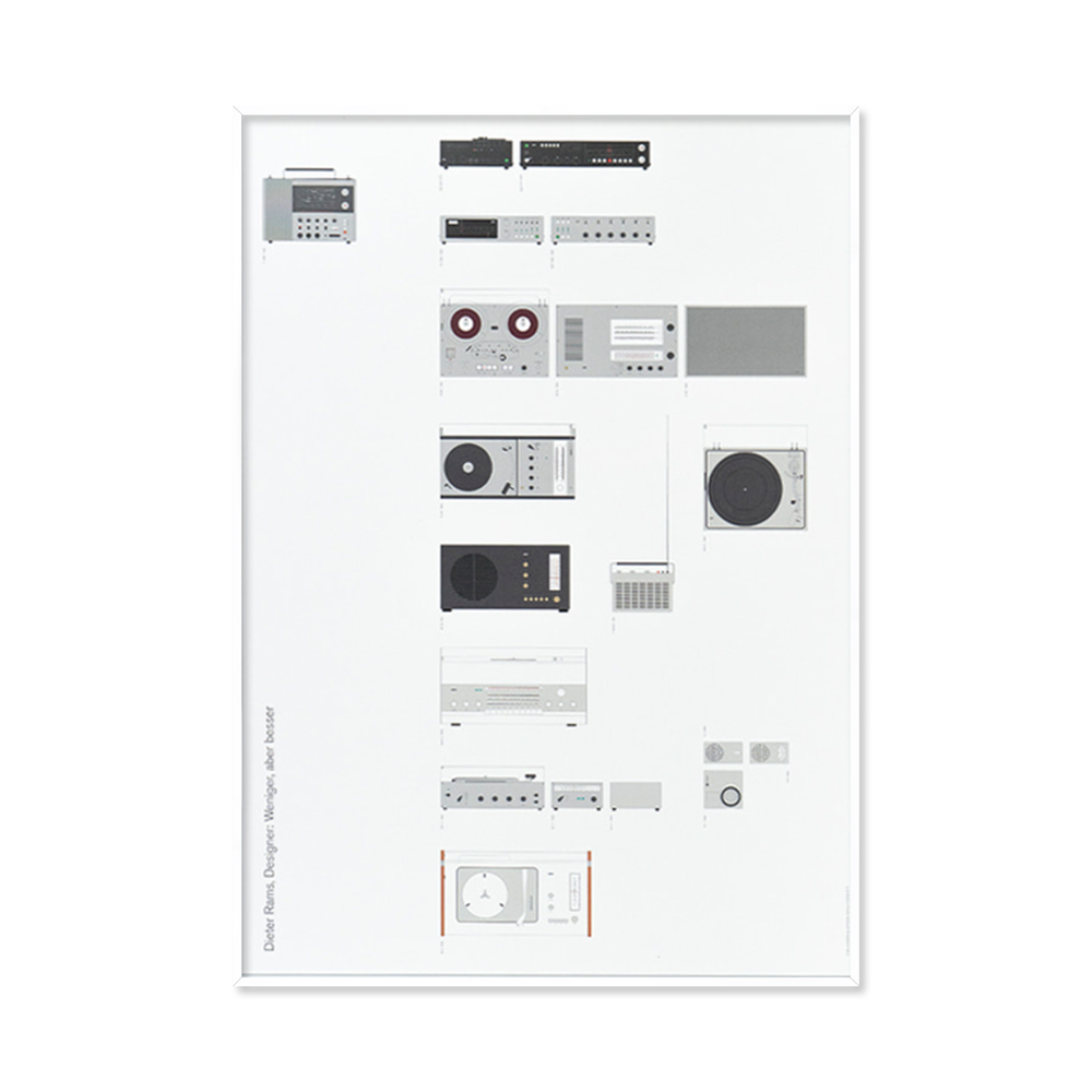포스터 속 제품은 브라운에서 출시하고 디터 람스가 디자인한 Radio TS 45, TG 60, T 1000이다.