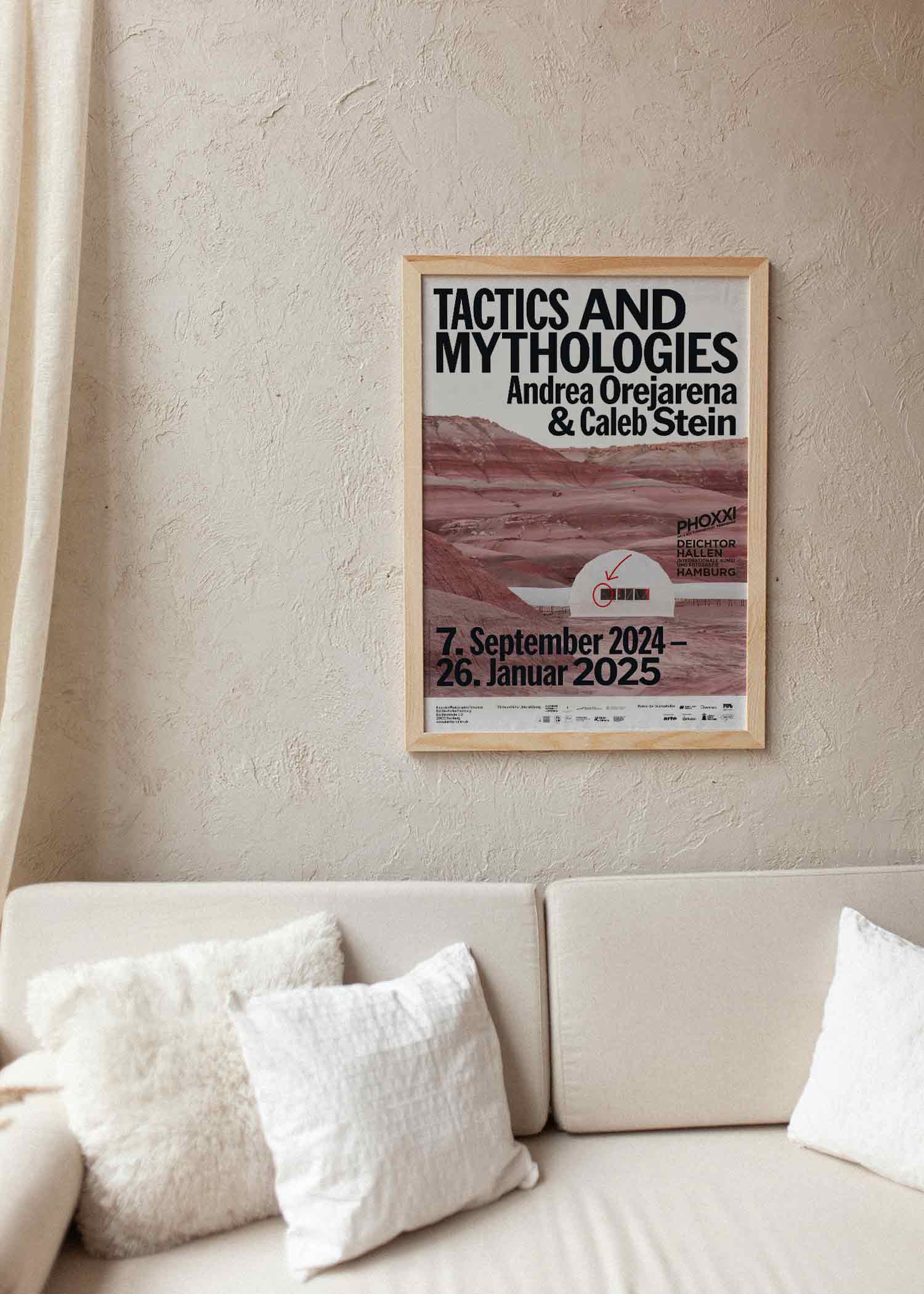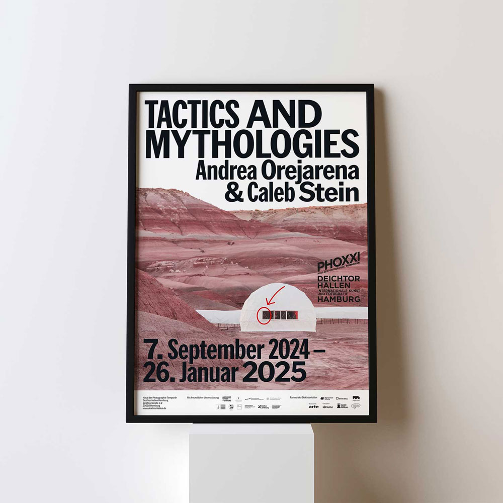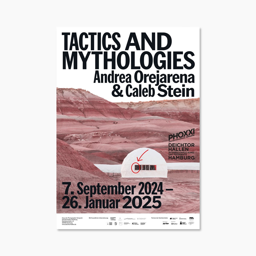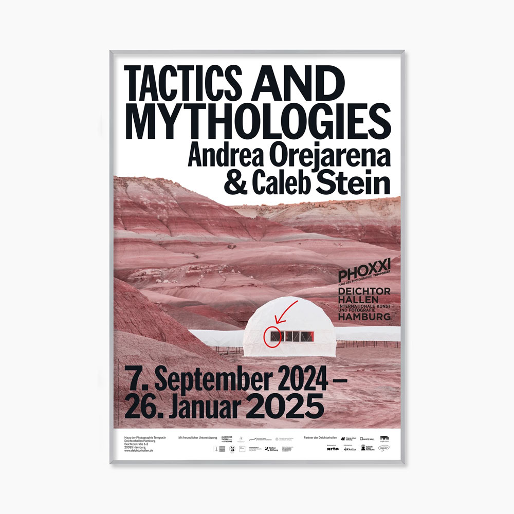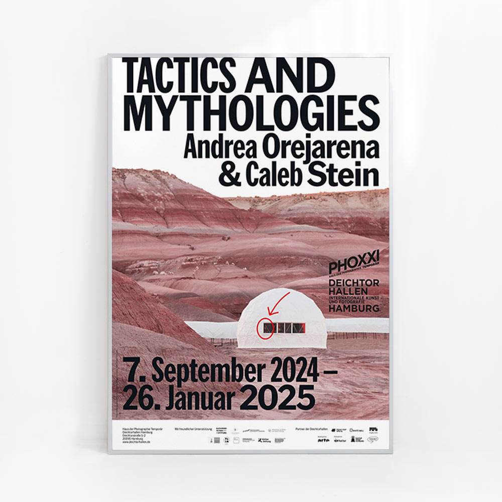 2024년 독일 함부르크의 ‘Deichtorhallen Hamburg’에서 개최한 뉴욕의 듀오 안드레아 오레자레나(Andrea Orejarena, 1994~ )와 캘럽 스타인(Caleb Stein, 1994 ~)의 유럽 최초 개인전 ‘TACTICS & MYTHOLOGIES’을 기념하기 위해 발행한 포스터다.