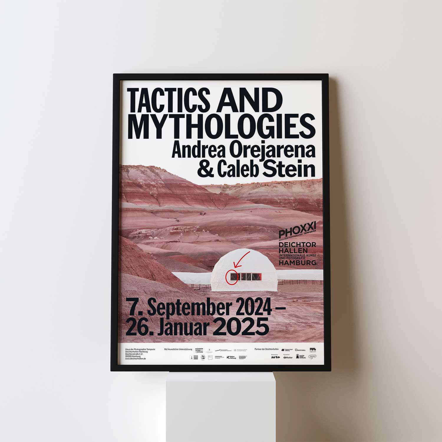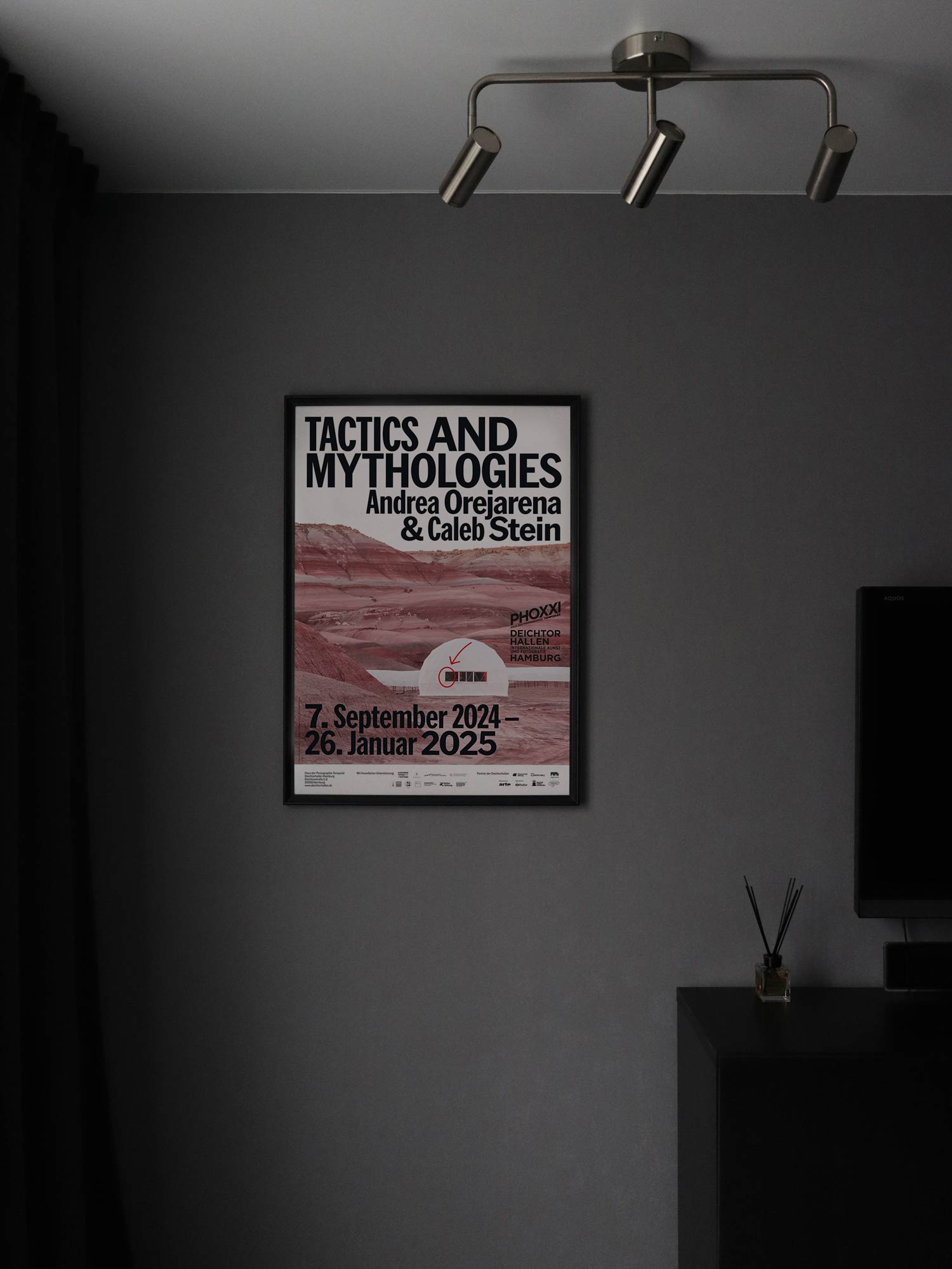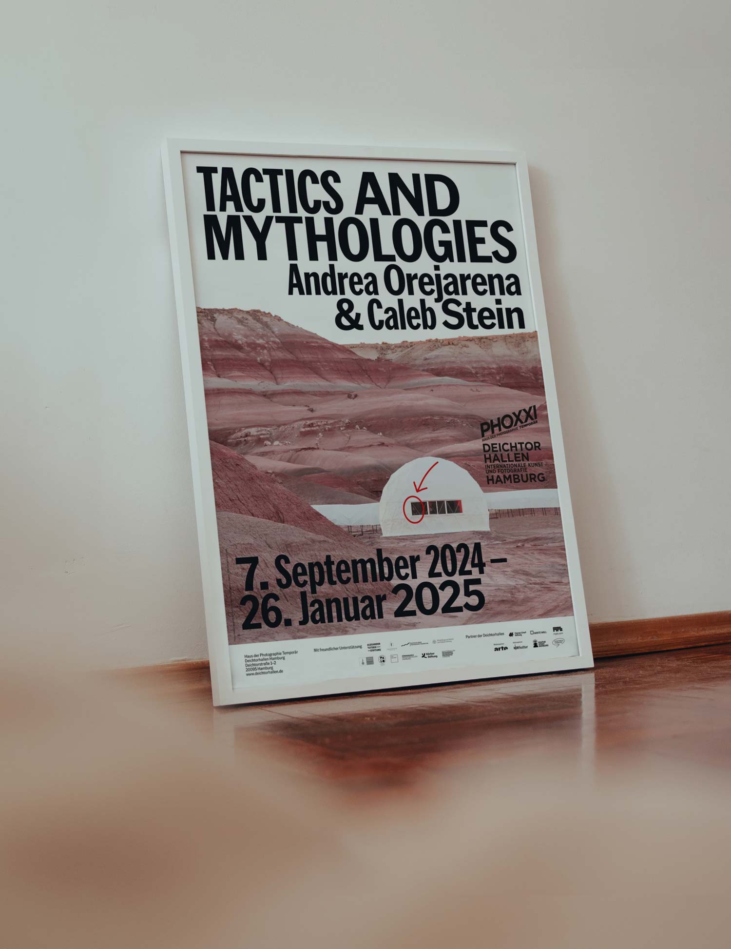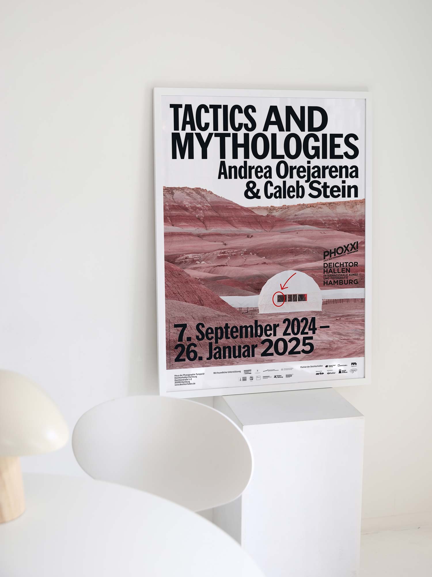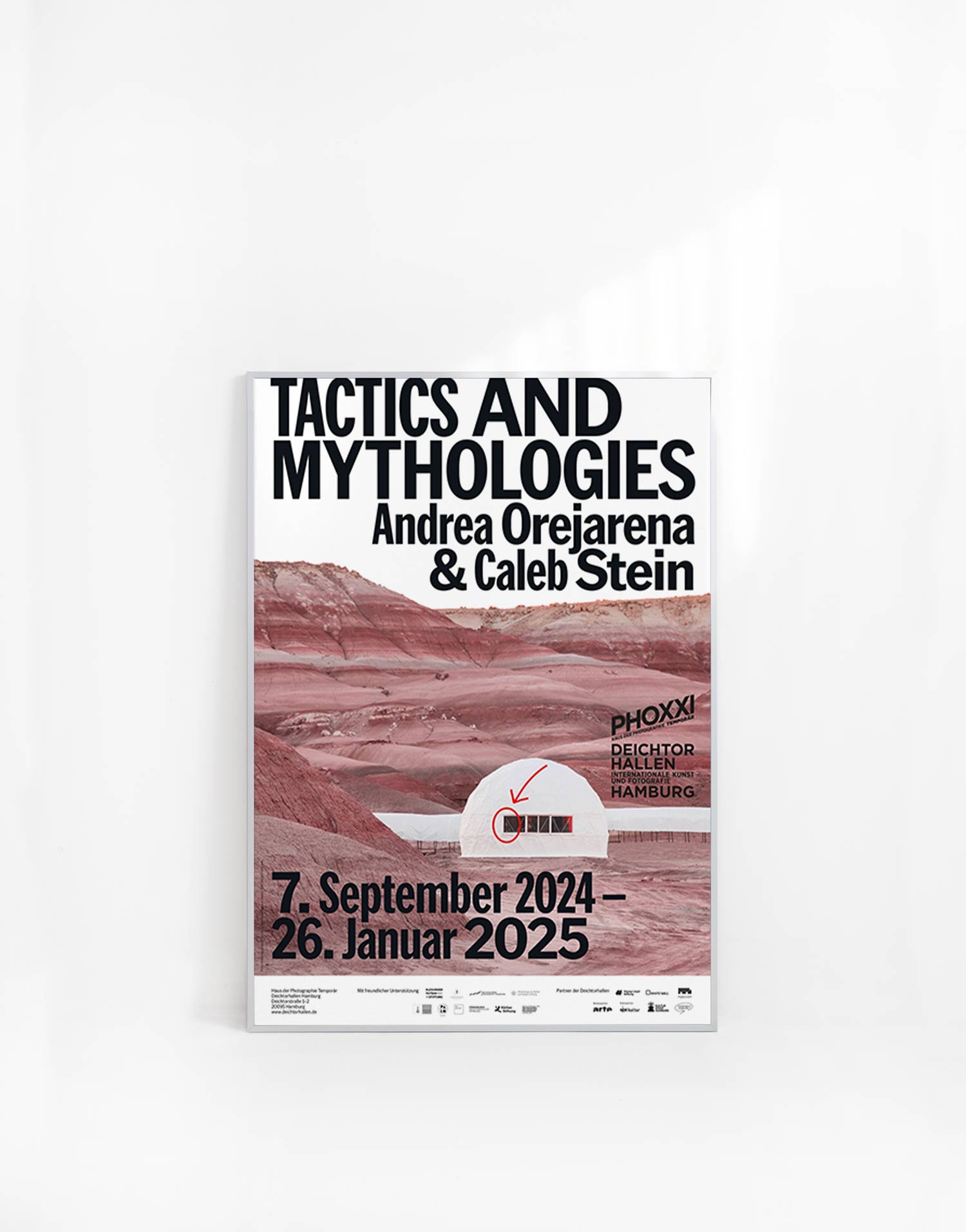 2024년 독일 함부르크의 ‘Deichtorhallen Hamburg’에서 개최한 뉴욕의 듀오 안드레아 오레자레나(Andrea Orejarena, 1994~ )와 캘럽 스타인(Caleb Stein, 1994 ~)의 유럽 최초 개인전 ‘TACTICS & MYTHOLOGIES’을 기념하기 위해 발행한 포스터다.